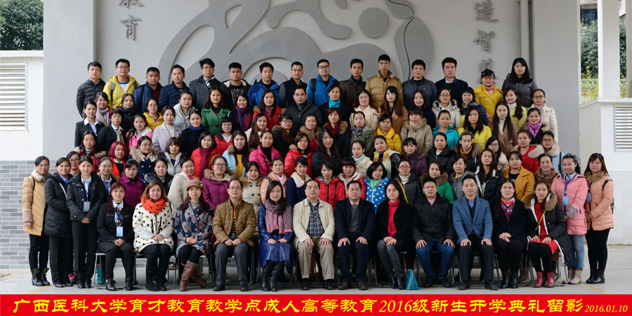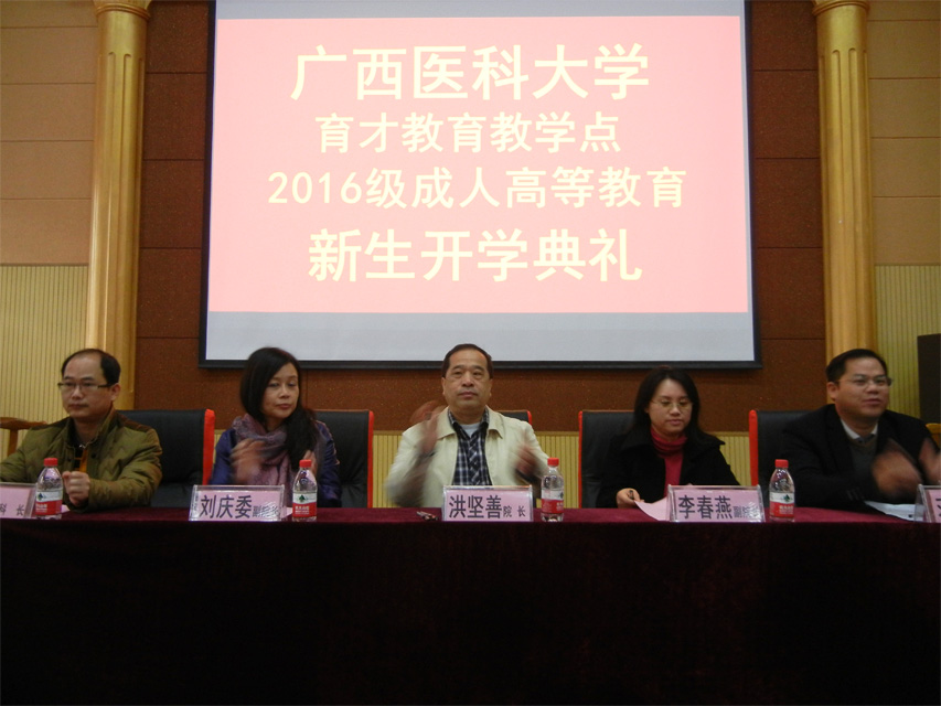 柳江濱,東環(huán)畔,花樣年華攜手共翻新篇章;望星空,踏實地,青春歲月同圓醫(yī)學翹楚夢。1月10日上午10:00,廣西醫(yī)科大學育才教育教學點2016級成人高等教育新生開學典禮在育才教育總部隆重舉行,廣西醫(yī)科大學成教院洪堅善院長、李春燕副院長、劉慶委副院長、馮政毅科長一行冒著寒風冷雨,百忙之中抽空出席了開學典禮,洪堅善院長作了重要講話。